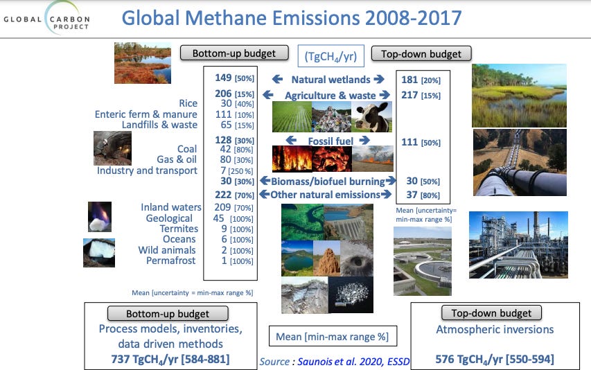 Even so, we have a dangerous predicament on our hands, and limiting global warming to “safe” thresholds will require major CH4 emissions cuts (equivalent to ~150Tg/yr). Even cutting 100% of fossil CH4 would not get us there - as these equate to roughly 120Tg/yr (depending on how you’re doing the counting). This means that to address global warming, CH4 emissions reductions are likely required in the agriculture sector too.
