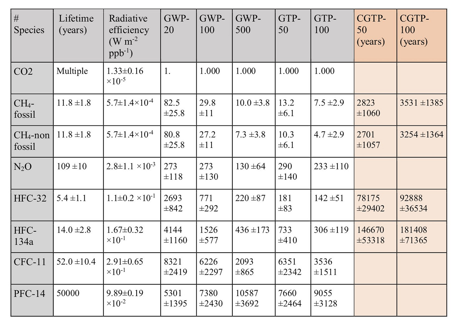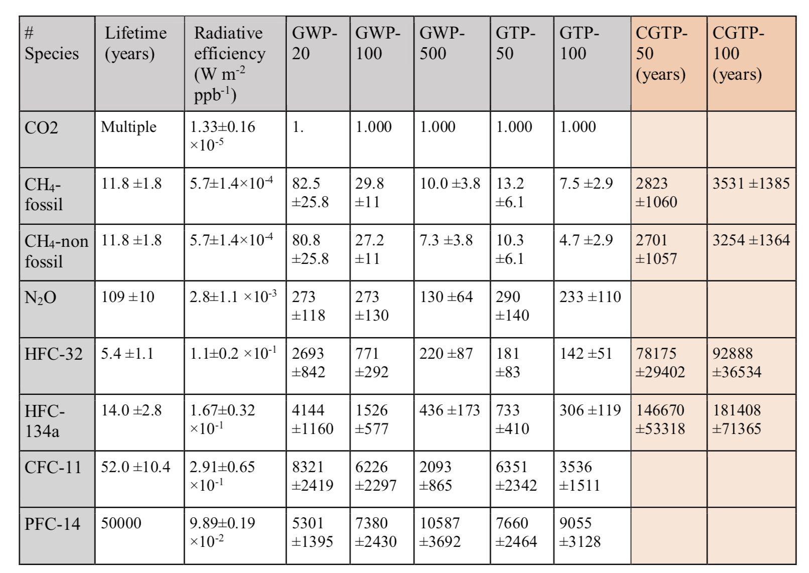 Nevertheless, the Global Warming Potential 100 (GWP100) of methane (aka: how much it heats the atmosphere over a period of 100 years) DOES vary between biogenic and fossil CH4. The following table from the IPCC's AR6 makes this clear [note different rows for CH4-fossil and CH4 non-fossil]:
