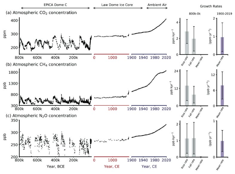 However, CH4 concentrations ARE increasing globally. And the global cattle herd is GROWING. Today we are way above the pre-industrial concentration of methane. Figure 5.4 from IPCC AR6 WG1 shows how dangerously high CH4 is today. A more recent assessment published by the Global Carbon Project notes that methane emissions are higher today than they likely have been for more than 800,000 years, and they continue to climb.