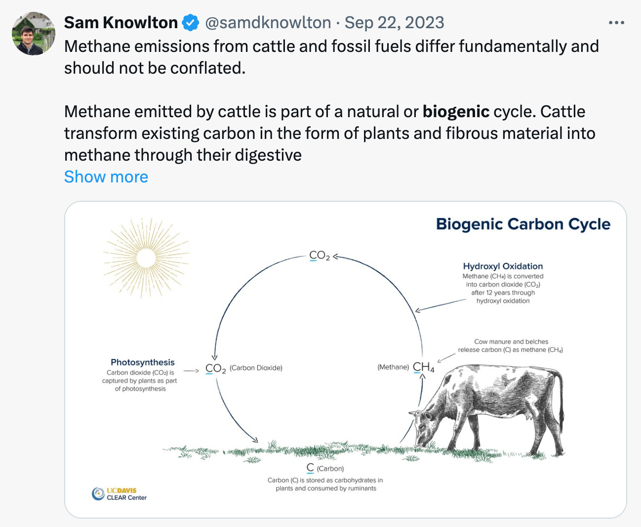 Is methane from cows the same for the climate as methane from fossil fuels? This question comes up often. Usually someone makes the assertion that biogenic methane (methane from animals and plants) is part of a natural cycle, and so it is merely cycling carbon and not adding to warming, while fossil methane is ancient carbon that marks a break from that cycle and thus contributes to global warming.